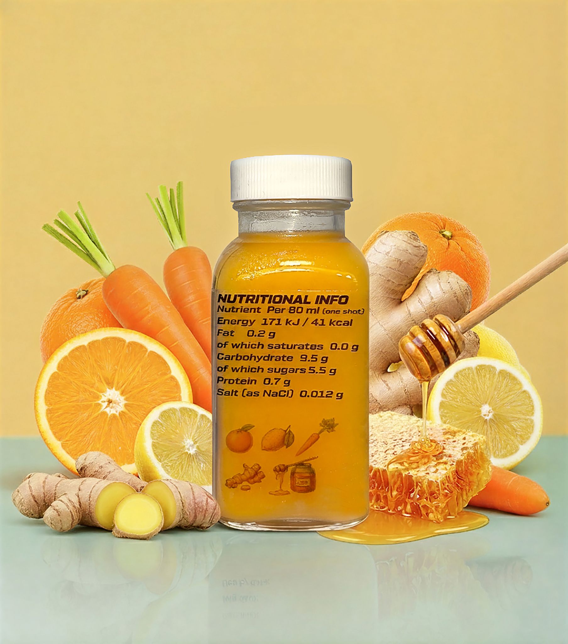 Made 100% from cold pressed - Orange , Ginger, lemon, Carrot and honey.